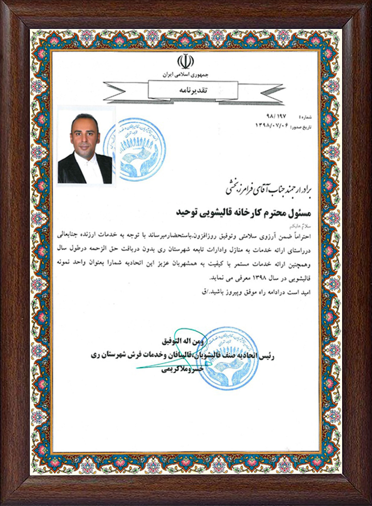 کارخانه قالیشویی توحید در سال 1367 شروع به کار کرد. این قالیشویی عضو رسمی اتحادیه قالیشویان می باشد. این قالیشویی در طول این مدت سابقه درخشان به خدمات رسانی در سراسر تهران، کرج، لواسانات … به مشتریان عزیز خدمت رسانی کرده است.